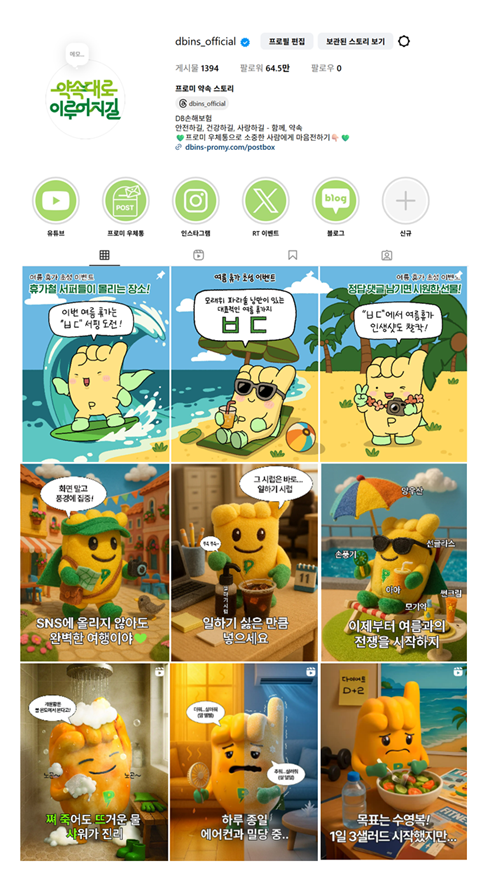 DB손해보험 공식 인스타그램 채널 ‘프로미 약속스타그램’은 64만명 이상의 팔로워 수를 보유한 ‘손해보험’ 업계 최대 규모의 채널로, DB손해보험의 공식 마스코트인 약속지킴이 ‘프로미’ 캐릭터를 활용하여, 웹툰 형태의 프로미 부터, 3D 프로미, 키링 인형 프로미, 탈인형 프로미 등 다양한 프로미들의 옴니버스형 콘텐츠를 재미있고 공감가는 스토리 중심으로 제공하고 있습니다.