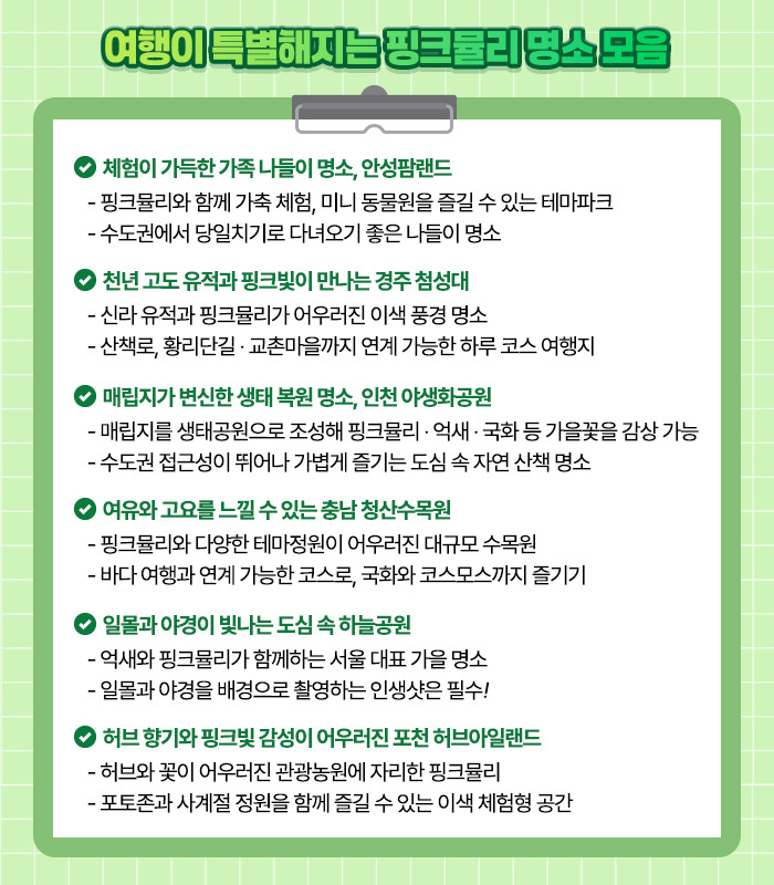 올가을에는 가족과 함께 핑크빛 물결을 거닐며 소중한 추억을 남겨보는 건 어떨까요?