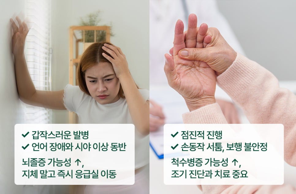 특히 뇌졸중과 척수병증은 초기 대응이 예후를 좌우하므로 신속한 판단과 행동이 필요합니다.
