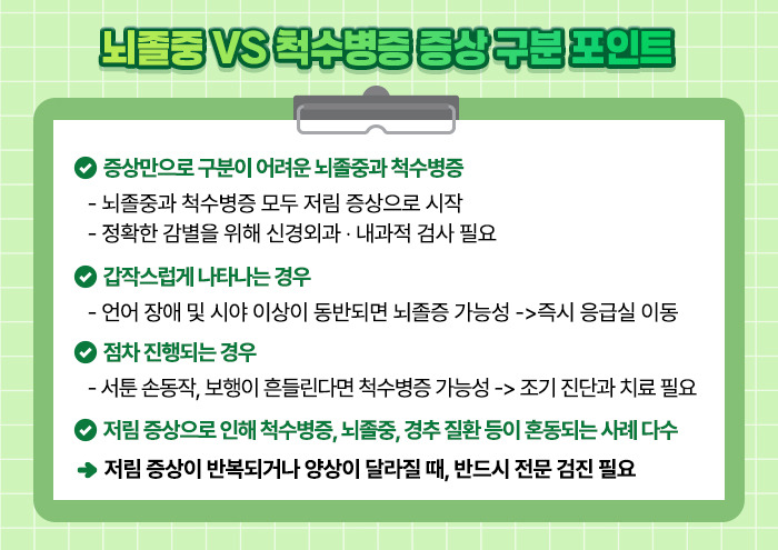 겉으로 보기에는 뇌졸중과 척수병증 모두 저림 증상이 나타나기 때문에 스스로 정확히 구분하기 어렵습니다.