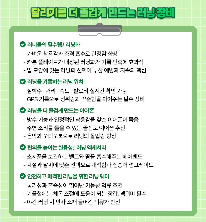 환경과 상황에 따라 필요한 액세서리를 갖추면 더욱 편안한 러닝을 즐길 수 있습니다.