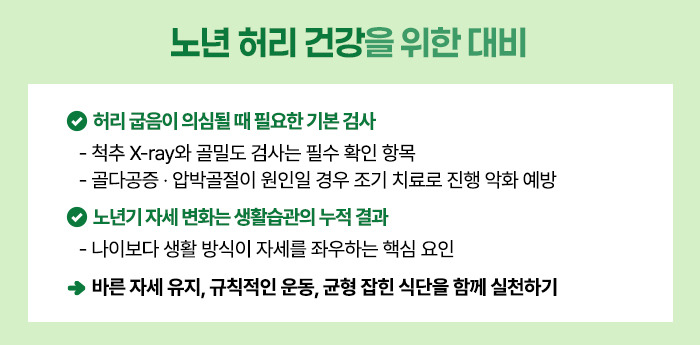 허리가 이미 굽었다면 척추 X-ray와 골밀도 검사를 반드시 받아야 합니다.