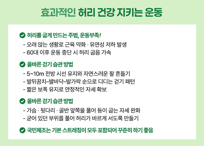 특히 60대 이후 운동을 멈추면 허리 굽음이 더욱 빠르게 진행됩니다.