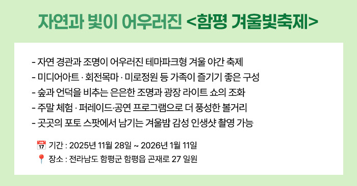 전남 함평에서 열리는 ‘함평 겨울빛축제’는 겨울 감성을 담은 테마파크형 야간 축제입니다.