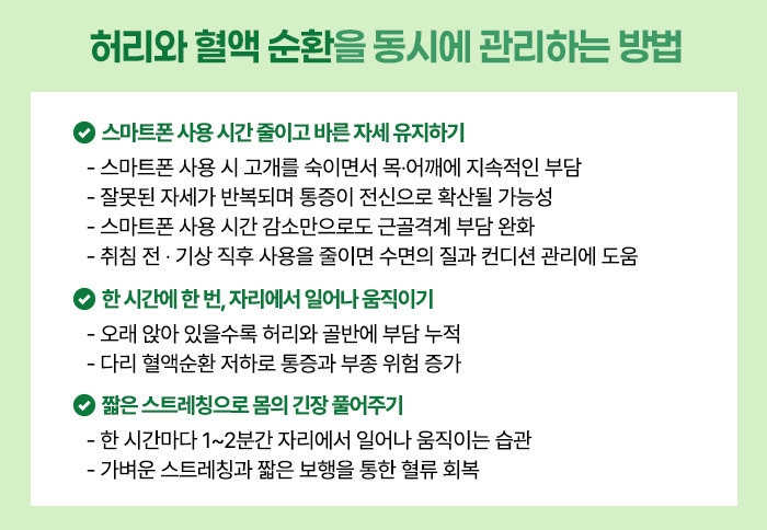 이런 자세가 반복되면 통증은 목과 어깨를 넘어 허리까지 이어지기 쉽습니다.